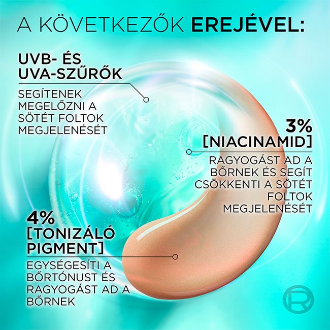 UV-szűrők: SPF 50+ nagyon magas, széles spektrumú védelem az UVB- és az UVA- sugarak ellen. Segítenek megelőzni a sötét foltokat és a bőröregedés látható jeleit. Niacinamid: ragyogást adó összetevő, amely segít csökkenteni a sötét foltok megjelenését. Tonizáló pigment: könnyű fedés az egyenletes bőrtónusért és a bőr ragyogásáért. A ragyogást adó, színezett fluid védi a bőrt, egységesíti a bőrtónust és segít megelőzni a sötét foltokat. Nem ragad, nem zsíros, nem tömíti el a pórusokat, nagyszerű sminkalap. Érzékeny bőrre is alkalmas.