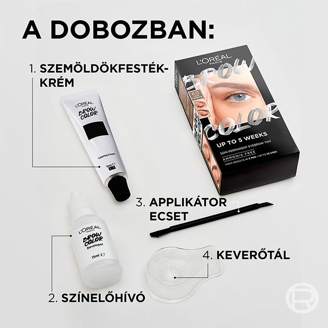 Hogyan lehet tökéletes a szemöldöke? Alaposan tisztítsa meg a szemöldökét, és távolítson el minden sminket. Vigyen fel bármilyen hidratálókrémet a szemöldökre, hogy védőréteget képezzen és megakadályozza a bőr elszíneződését. Keverje össze a szemöldökfesték-krémet a színelőhívóval a használati utasításban leírtak szerint. Vigye fel a szemöldökére a csomagban található ecsettel. Törölje le a szélek mentén az applikátor hegyével a forma meghatározásáért. Várjon 5-10 percet a kívánt árnyalat intenzitásától függően. Nedves vattakorongokkal távolítsa el a keveréket. A tartozékot száraz helyen tárolja.