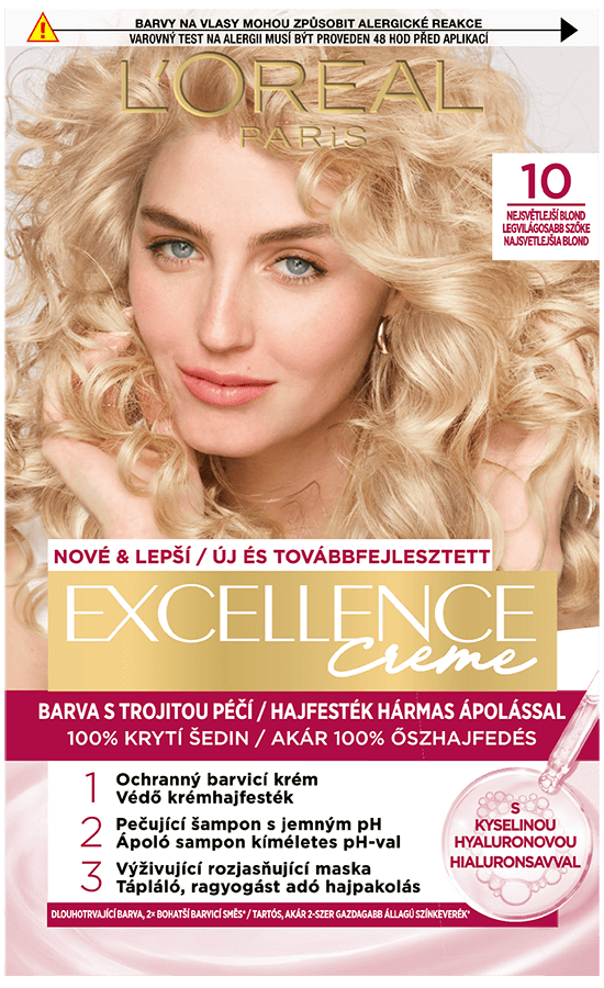 Ápoló hatóanyagokkal gazdagított tartós hajfesték. A L'Oréal Paris Excellence most egy hialuronsavval gazdagított hármas ápoló hatású hajfestési rituálét mutat be, amely gondoskodik a hajszínről, gyengéd a fejbőrhöz és ápolja a hajat. Az új, ápoló sampon kíméletes pH-val a hajat puhává, fényessé és természetes színűvé varázsolja. Akár 100%-os ősz haj fedés. A hialuronsav egy erőteljes, nedvességet rögzítő molekula, amely természetesen jelen van a szervezetben és a saját súlyának akár 1000-szeresét is képes megtartani vízből. Hogyan hat a formula? 1. A védő krémhajfesték intenzív hidratálással itatja át a hajat a korábbi színkeverékünkhöz képest akár 2-szer gazdagabb állagú színkeverékkel* a nem csöpögő felvitelért. 2. A tápláló hajpakolás a hajfestés előtti hidratáltsághoz képest akár 10-szer több hidratálással** zárja le a kutikulákat a tartósan ragyogó színért. *a korábbi színkeverékünkhöz képest, műszeres viszkozitási teszt. **Műszeres teszt