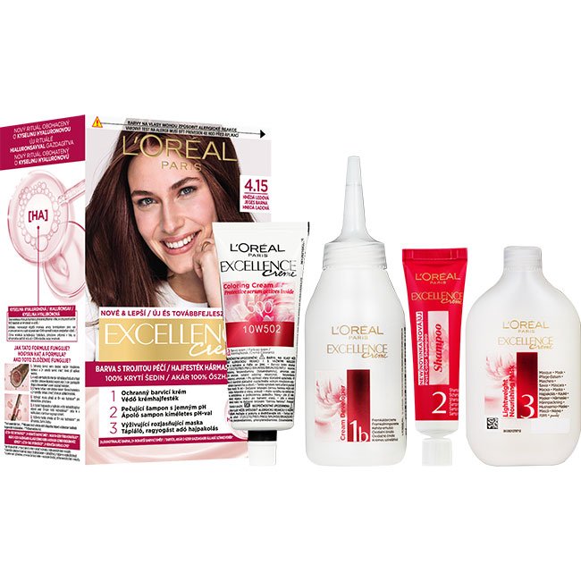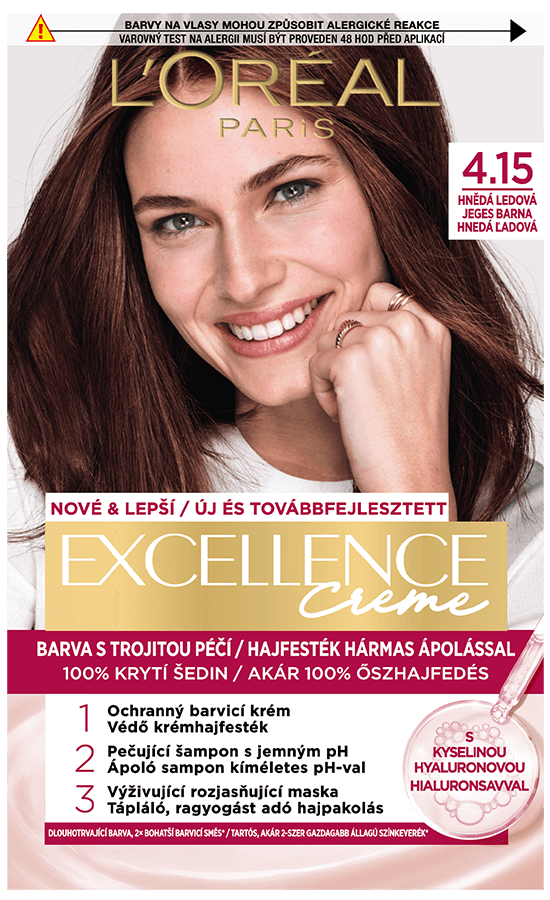 Ápoló hatóanyagokkal gazdagított tartós hajfesték. A L'Oréal Paris Excellence most egy hialuronsavval gazdagított hármas ápoló hatású hajfestési rituálét mutat be, amely gondoskodik a hajszínről, gyengéd a fejbőrhöz és ápolja a hajat. Az új, ápoló sampon kíméletes pH-val a hajat puhává, fényessé és természetes színűvé varázsolja. Akár 100%-os ősz haj fedés. A hialuronsav egy erőteljes, nedvességet rögzítő molekula, amely természetesen jelen van a szervezetben és a saját súlyának akár 1000-szeresét is képes megtartani vízből. Hogyan hat a formula? 1. A védő krémhajfesték intenzív hidratálással itatja át a hajat a korábbi színkeverékünkhöz képest akár 2-szer gazdagabb állagú színkeverékkel* a nem csöpögő felvitelért. 2. A tápláló hajpakolás a hajfestés előtti hidratáltsághoz képest akár 10-szer több hidratálással** zárja le a kutikulákat a tartósan ragyogó színért. *a korábbi színkeverékünkhöz képest, műszeres viszkozitási teszt. **Műszeres teszt