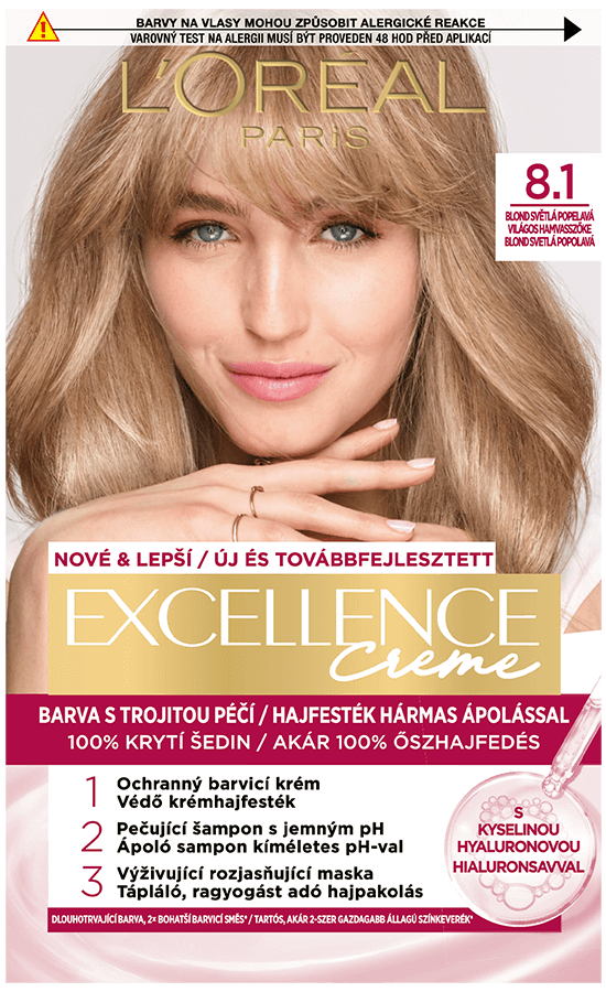 Ápoló hatóanyagokkal gazdagított tartós hajfesték. A L'Oréal Paris Excellence most egy hialuronsavval gazdagított hármas ápoló hatású hajfestési rituálét mutat be, amely gondoskodik a hajszínről, gyengéd a fejbőrhöz és ápolja a hajat. Az új, ápoló sampon kíméletes pH-val a hajat puhává, fényessé és természetes színűvé varázsolja. Akár 100%-os ősz haj fedés. A hialuronsav egy erőteljes, nedvességet rögzítő molekula, amely természetesen jelen van a szervezetben és a saját súlyának akár 1000-szeresét is képes megtartani vízből. Hogyan hat a formula? 1. A védő krémhajfesték intenzív hidratálással itatja át a hajat a korábbi színkeverékünkhöz képest akár 2-szer gazdagabb állagú színkeverékkel* a nem csöpögő felvitelért. 2. A tápláló hajpakolás a hajfestés előtti hidratáltsághoz képest akár 10-szer több hidratálással** zárja le a kutikulákat a tartósan ragyogó színért. *a korábbi színkeverékünkhöz képest, műszeres viszkozitási teszt. **Műszeres teszt