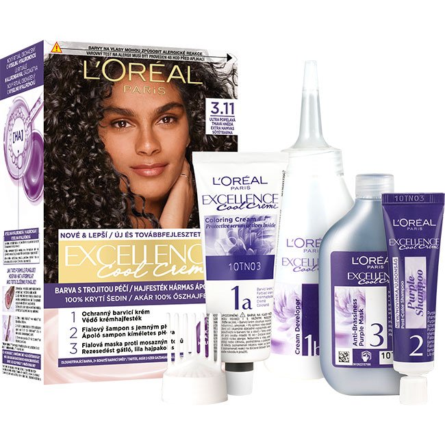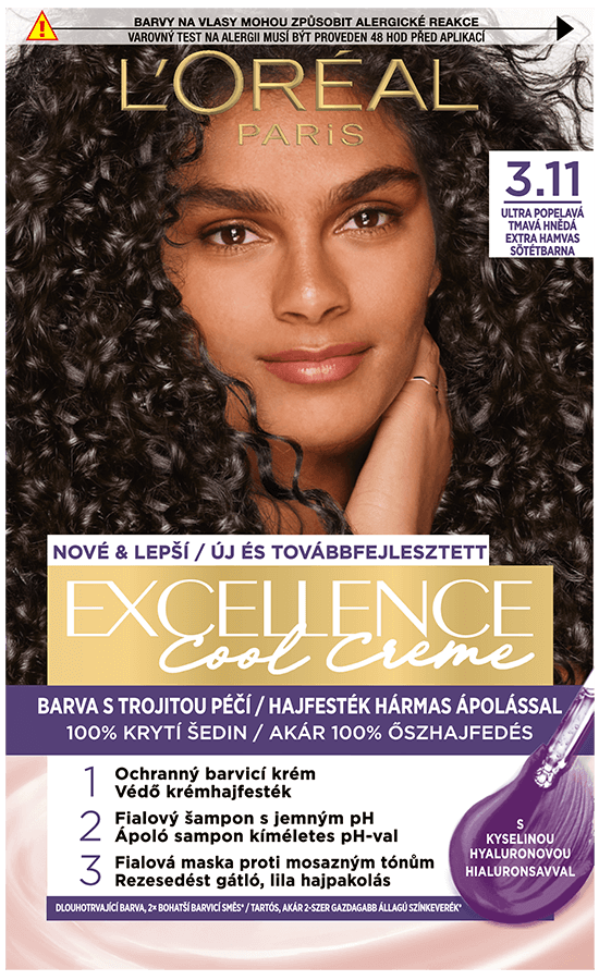 Ápoló hatóanyagokkal gazdagított tartós hajfesték. A L'Oréal Paris Excellence most egy hialuronsavval gazdagított hármas ápoló hatású hajfestési rituálét mutat be, amely gondoskodik a hajszínről, gyengéd a fejbőrhöz és ápolja a hajat. Az új, ápoló sampon kíméletes pH-val a hajat puhává, fényessé és természetes színűvé varázsolja. Akár 100%-os őszhajfedés. A hialuronsav egy erőteljes, nedvességet rögzítő molekula, amely természetesen jelen van a szervezetben és a saját súlyának akár 1000-szeresét is képes megtartani vízből. Hogyan hat a formula? 1. A védő krémhajfesték intenzív hidratálással itatja át a hajat a korábbi színkeverékünkhöz képest akár 2-szer gazdagabb állagú színkeverékkel* a nem csöpögő felvitelért. 2. A tápláló hajpakolás a hajfestés előtti hidratáltsághoz képest akár 5-ször több hidratálással** zárja le a kutikulákat a tartósan ragyogó színért. Az Excellence Cool Creme tartalmaz továbbá egy ápoló sampont kíméletes pH-val és egy rezesedést gátló, lila hajpakolást is a hamvas színeredményért. *a korábbi színkeverékünkhöz képest, műszeres viszkozitási teszt. **Műszeres teszt
