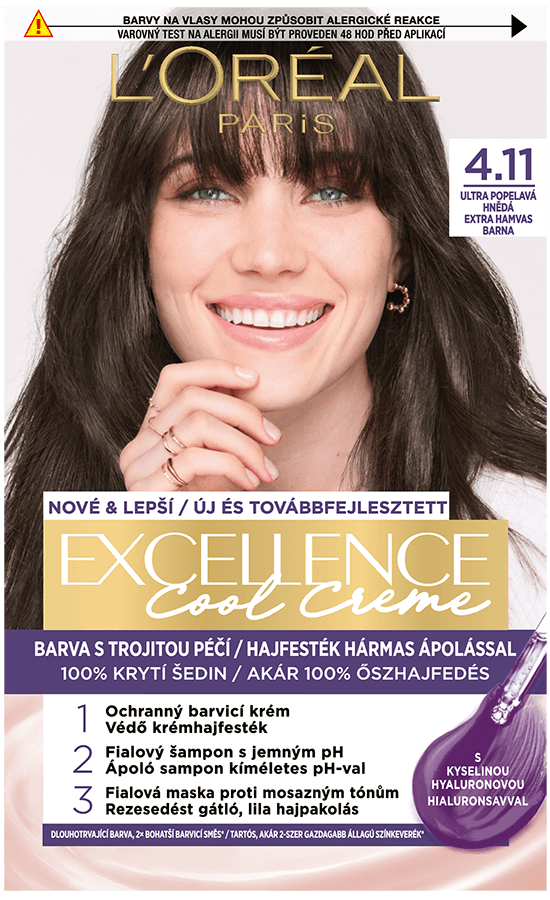 Ápoló hatóanyagokkal gazdagított tartós hajfesték. A L'Oréal Paris Excellence most egy hialuronsavval gazdagított hármas ápoló hatású hajfestési rituálét mutat be, amely gondoskodik a hajszínről, gyengéd a fejbőrhöz és ápolja a hajat. Az új, ápoló sampon kíméletes pH-val a hajat puhává, fényessé és természetes színűvé varázsolja. Akár 100%-os őszhajfedés. A hialuronsav egy erőteljes, nedvességet rögzítő molekula, amely természetesen jelen van a szervezetben és a saját súlyának akár 1000-szeresét is képes megtartani vízből. Hogyan hat a formula? 1. A védő krémhajfesték intenzív hidratálással itatja át a hajat a korábbi színkeverékünkhöz képest akár 2-szer gazdagabb állagú színkeverékkel* a nem csöpögő felvitelért. 2. A tápláló hajpakolás a hajfestés előtti hidratáltsághoz képest akár 5-ször több hidratálással** zárja le a kutikulákat a tartósan ragyogó színért. Az Excellence Cool Creme tartalmaz továbbá egy ápoló sampont kíméletes pH-val és egy rezesedést gátló, lila hajpakolást is a hamvas színeredményért. *a korábbi színkeverékünkhöz képest, műszeres viszkozitási teszt. **Műszeres teszt
