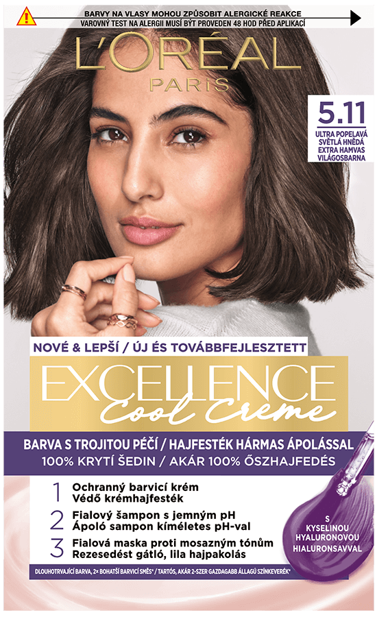 Ápoló hatóanyagokkal gazdagított tartós hajfesték. A L'Oréal Paris Excellence most egy hialuronsavval gazdagított hármas ápoló hatású hajfestési rituálét mutat be, amely gondoskodik a hajszínről, gyengéd a fejbőrhöz és ápolja a hajat. Az új, ápoló sampon kíméletes pH-val a hajat puhává, fényessé és természetes színűvé varázsolja. Akár 100%-os őszhajfedés. A hialuronsav egy erőteljes, nedvességet rögzítő molekula, amely természetesen jelen van a szervezetben és a saját súlyának akár 1000-szeresét is képes megtartani vízből. Hogyan hat a formula? 1. A védő krémhajfesték intenzív hidratálással itatja át a hajat a korábbi színkeverékünkhöz képest akár 2-szer gazdagabb állagú színkeverékkel* a nem csöpögő felvitelért. 2. A tápláló hajpakolás a hajfestés előtti hidratáltsághoz képest akár 5-ször több hidratálással** zárja le a kutikulákat a tartósan ragyogó színért. Az Excellence Cool Creme tartalmaz továbbá egy ápoló sampont kíméletes pH-val és egy rezesedést gátló, lila hajpakolást is a hamvas színeredményért. *a korábbi színkeverékünkhöz képest, műszeres viszkozitási teszt. **Műszeres teszt