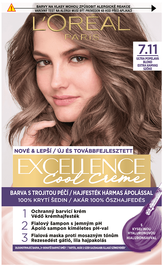 Ápoló hatóanyagokkal gazdagított tartós hajfesték. A L'Oréal Paris Excellence most egy hialuronsavval gazdagított hármas ápoló hatású hajfestési rituálét mutat be, amely gondoskodik a hajszínről, gyengéd a fejbőrhöz és ápolja a hajat. Az új, ápoló sampon kíméletes pH-val a hajat puhává, fényessé és természetes színűvé varázsolja. Akár 100%-os őszhajfedés. A hialuronsav egy erőteljes, nedvességet rögzítő molekula, amely természetesen jelen van a szervezetben és a saját súlyának akár 1000-szeresét is képes megtartani vízből. Hogyan hat a formula? 1. A védő krémhajfesték intenzív hidratálással itatja át a hajat a korábbi színkeverékünkhöz képest akár 2-szer gazdagabb állagú színkeverékkel* a nem csöpögő felvitelért. 2. A tápláló hajpakolás a hajfestés előtti hidratáltsághoz képest akár 5-ször több hidratálással** zárja le a kutikulákat a tartósan ragyogó színért. Az Excellence Cool Creme tartalmaz továbbá egy ápoló sampont kíméletes pH-val és egy rezesedést gátló, lila hajpakolást is a hamvas színeredményért. *a korábbi színkeverékünkhöz képest, műszeres viszkozitási teszt. **Műszeres teszt