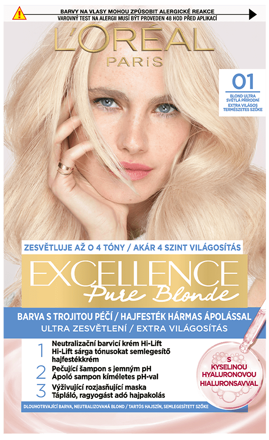 High-lift sárga tónusokat semlegesítő tartós hajfestékkrém ápoló hatóanyagokkal gazdagítva A L'Oréal Paris Excellence most egy hialuronsavval gazdagított hármas ápoló hatású hajfestési rituálét mutat be, amely gondoskodik a hajszínről, gyengéd a fejbőrhöz és ápolja a hajat. Az új, ápoló sampon kíméletes pH-val a hajat puhává, fényessé és természetes színűvé varázsolja. A hialuronsav egy erőteljes, nedvességet rögzítő molekula, amely természetesen jelen van a szervezetben és a saját súlyának akár 1000-szeresét is képes megtartani vízből. Hogyan hat a formula? A tápláló hajpakolás a hajfestés előtti hidratáltsághoz képest akár 10-szer több hidratálással* zárja le a kutikulákat a tartósan ragyogó színért. Az extra világosítás akár 4 szinttel világosítja a hajat. *Műszeres teszt