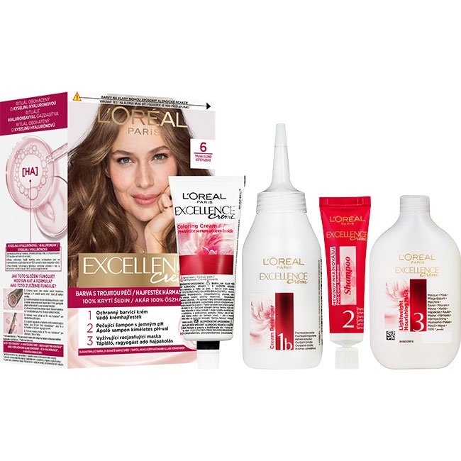 Ápoló hatóanyagokkal gazdagított tartós hajfesték. A L'Oréal Paris Excellence most egy hialuronsavval gazdagított hármas ápoló hatású hajfestési rituálét mutat be, amely gondoskodik a hajszínről, gyengéd a fejbőrhöz és ápolja a hajat. Az új, ápoló sampon kíméletes pH-val a hajat puhává, fényessé és természetes színűvé varázsolja. Akár 100%-os ősz haj fedés. A hialuronsav egy erőteljes, nedvességet rögzítő molekula, amely természetesen jelen van a szervezetben és a saját súlyának akár 1000-szeresét is képes megtartani vízből. Hogyan hat a formula? 1. A védő krémhajfesték intenzív hidratálással itatja át a hajat a korábbi színkeverékünkhöz képest akár 2-szer gazdagabb állagú színkeverékkel* a nem csöpögő felvitelért. 2. A tápláló hajpakolás a hajfestés előtti hidratáltsághoz képest akár 10-szer több hidratálással** zárja le a kutikulákat a tartósan ragyogó színért. *a korábbi színkeverékünkhöz képest, műszeres viszkozitási teszt. **Műszeres teszt