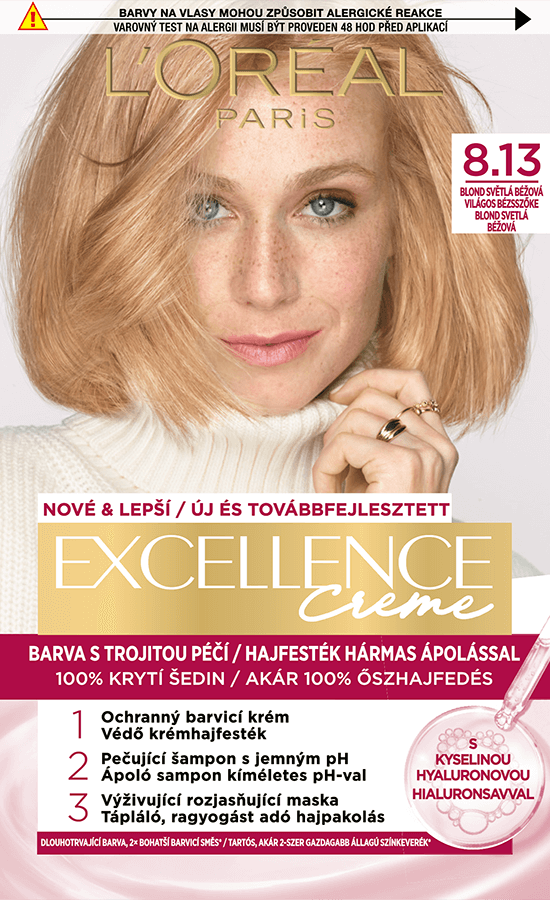 A L'ORÉAL PARIS bemutatja a legendás Excellence hajfesték megújított kollekcióját hármas védelemmel, a még gazdagabb árnyalatokért. HÁRMAS ÁPOLÁS RITUÁLÉ, amely gyönyörűvé teszi a hajszínt, ápolja a fejbőrt és a hajat. Új utóápoló sampon kíméletes pH-val, amely felfedi a ragyogást, simítja a hajat és természetes színeredményt nyújt. Akár 100%-os őszhaj-fedés.