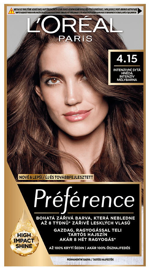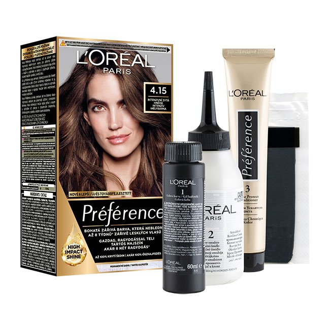 A Préférence tartós hajfesték elfedi az ősz hajszálakat, és gazdag, ragyogással teli, nem kifakuló hajszínt eredményez. L'Oréal Paris Préférence a Fade-Defying SYSTEMTM erejével. A hosszantartó hajfestékek magas koncentrációja az új olaj-gél textúrával kombinálva akár 8 hétig tartó kopásgátló színt és erős ragyogást* biztosít. Akár 100% őszhajfedés. A dobozban megtalálható továbbá az UV-szűrővel és E-vitaminnal gazdagított színvédő hajápoló is. *Műszeres teszt
