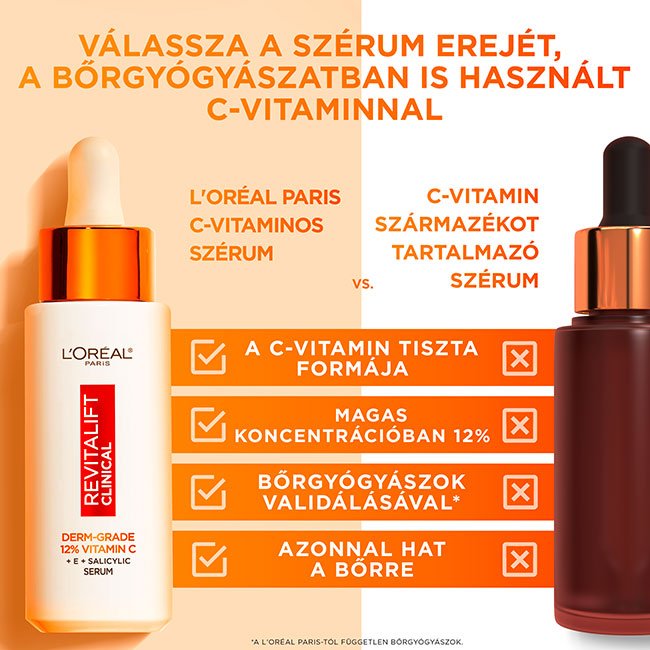 A tiszta C-vitamin, más néven L-aszkorbinsav, egy erőteljes antioxidáns és a C-vitamin egyetlen biológiailag aktív formája – nem véletlen, hogy ez a bőrgyógyászok által leggyakrabban alkalmazott változat. Semlegesíti a szabad gyököket, ezáltal fokozza a bőr védekezőképességét a külső stressztényezők, például az UV-sugárzás és a szennyeződések elleni küzdelemben, melyek befolyásolják a bőr ragyogását és felgyorsíthatják az öregedését. Helyileg alkalmazva fokozza a bőr ragyogását, csökkenti a hiperpigmentációt és a sötét foltokat (amelyeket a napfény, az életkor és a pattanásnyomok okoznak), valamint serkenti a kollagéntermelést.