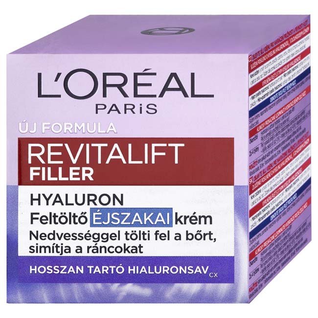 A L'Oréal Paris megújított formulája most egy fejlett technológiát tartalmaz: a hatékony, hosszan tartó hialuronsavatCX. Az új formula a bőr felszínén ellenálló réteget képez, amely akár 7 napig is képes rögzíteni a hidratálást*. A formula intenzíven behatol a ráncok feltöltéséért és a bőr teltségének regenerálásáért. A hatékony formula 3 féle hialuronsavat tartalmaz az intenzíven hidratáló és teltséget adó hatásért: a nagy molekulasúlyú hialuronsav hidratálja a bőrfelszínt, a kis molekulasúlyú hialuronsav nedvességgel tölti fel a bőr felső rétegét, a mikroepidermális hialuronsav: belülről tölti fel a ráncokat és intenzíven** hidratálja a bőrt. A hialuronsavval és galangakivonattal gazdagított formula segít mélyen feltölteni az alvás közben megjelenő ráncokat és frissességét adni a bőrnek. * Klinikai pontozás 58 nővel. **A bőr felső rétegeiben