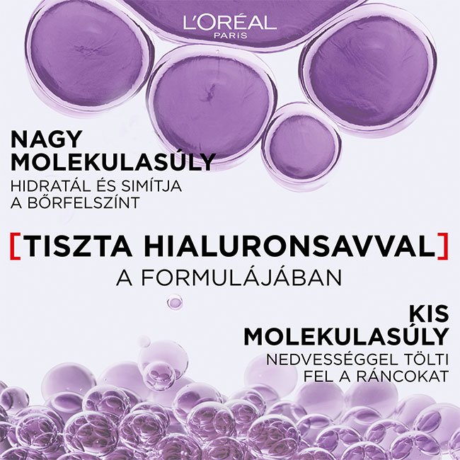 Három típusú hialuronsavval: - nagy molekulasúlyú hialuronsav: segít azonnal hidratálni és simává varázsolni a bőrfelszínt. - kis molekulasúlyú hialuronsav: behatol a bőr felszíni rétegeibe a bőr és a ráncok intenzív nedvességgel történő feltöltéséért. - mikroepidermális hialuronsav: a hialuronsav új generációja, 50-szer kisebb, mint a nagy molekulasúlyú hialuronsav. Mélyebbre hatol a bőr felszíni rétegeiben a kisebb és nagyobb ráncok nedvességgel történő feltöltéséért. Glicerinnel az intenzív hidratálásért és Cg-vitaminnal a ragyogás elősegítéséért. Intenzíven hidratált, nedvességgel feltöltöttnek, rugalmasnak érződő bőr.