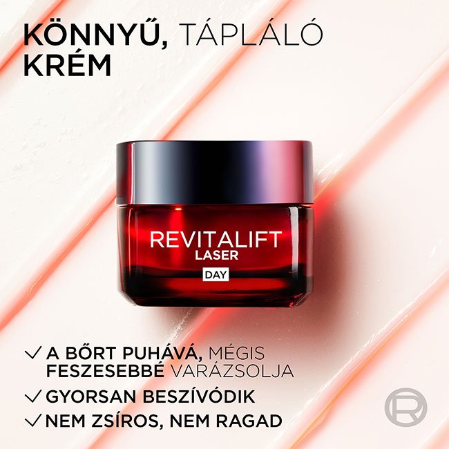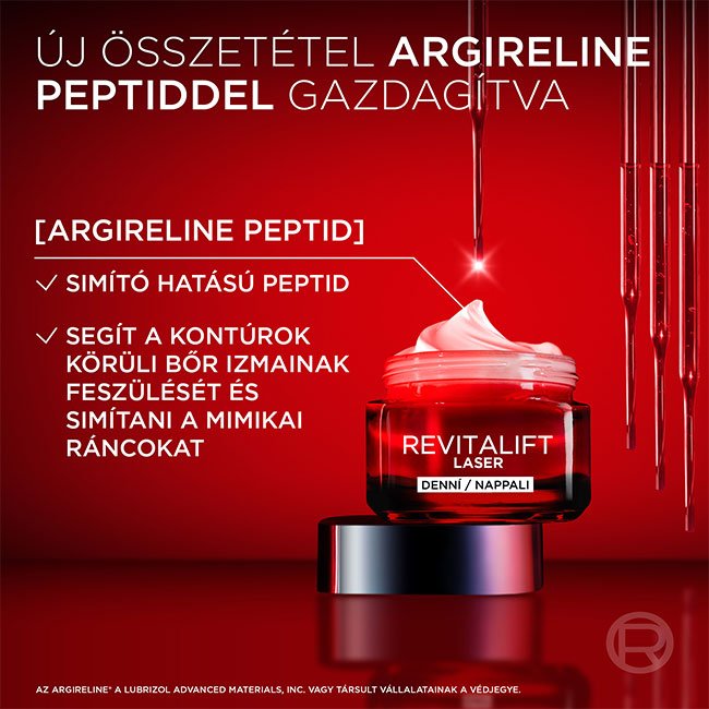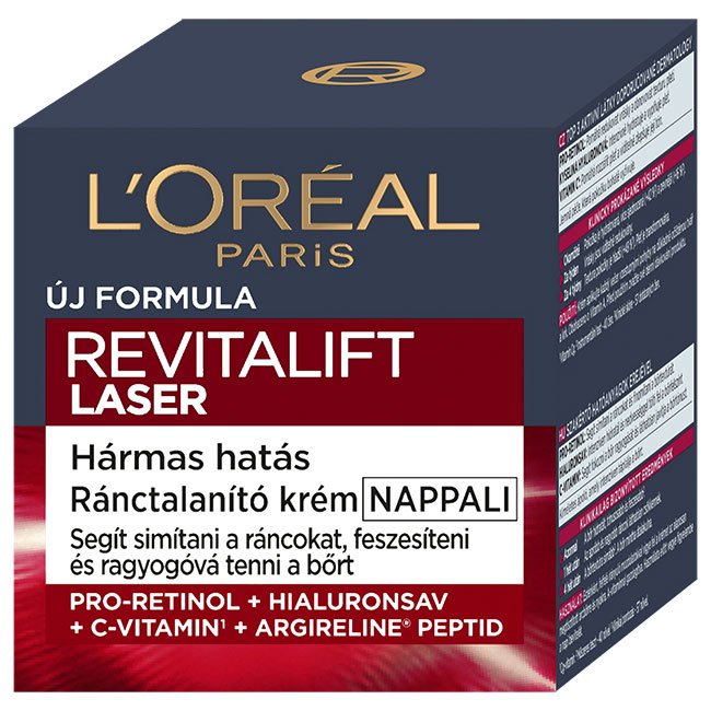 Revitalift Laser nappali ránctalanító krém szakértő hatanyagok erejével: PRO-RETINOL Segít simítani a ráncokat és finomítani a bőrtextúrát. HIALURONSAV Intenzíven hidratál és nedvességgel tölti fel a bőrfelszínt. C-VITAMIN* Segít fokozni a bőr ragyogását és láthatóan javítja a bőrtónust. MOST ARGIRELINE® PEPTIDDEL GAZDAGÍTVA Bőrnyugtató hatású peptid, amely segít a kontúrok körüli bőr izmainak feszülésének oldásában és a ráncok simításában. Ez a tápláló, könnyű krém gyorsan beszívódik, a bőrt puhává, mégis feszes érzetűvé varázsolja. Nem zsíros. Nem ragad. *Az Argireline® a Lubrizol Advanced Materials, Inc. vagy üzleti partnereinek védjegye.